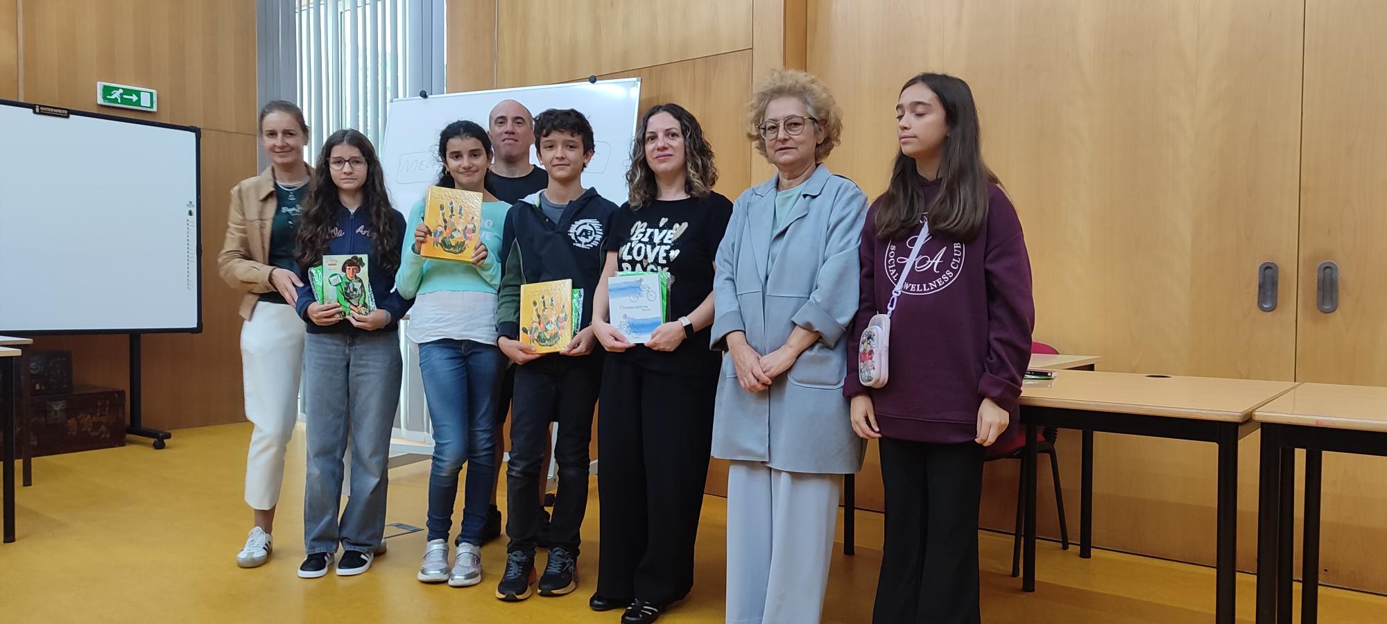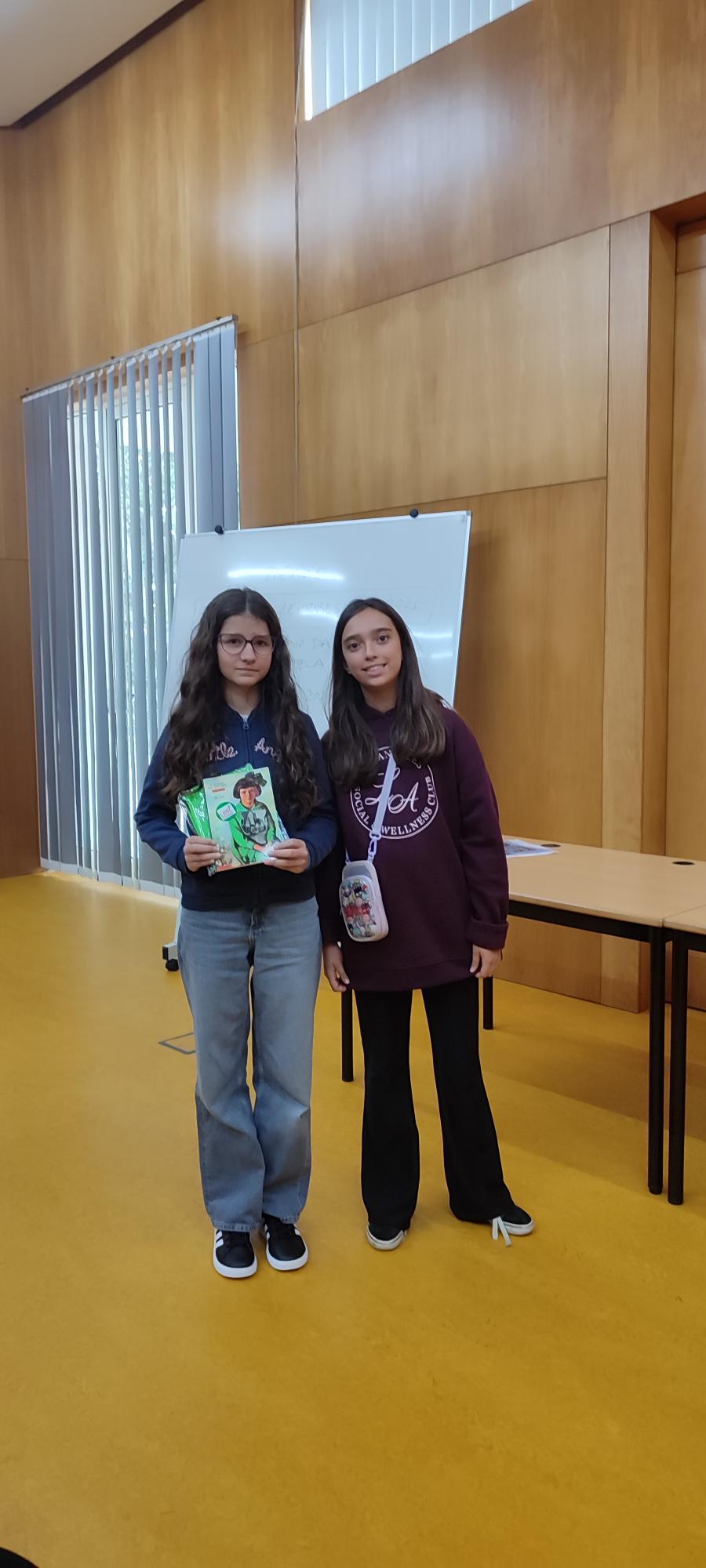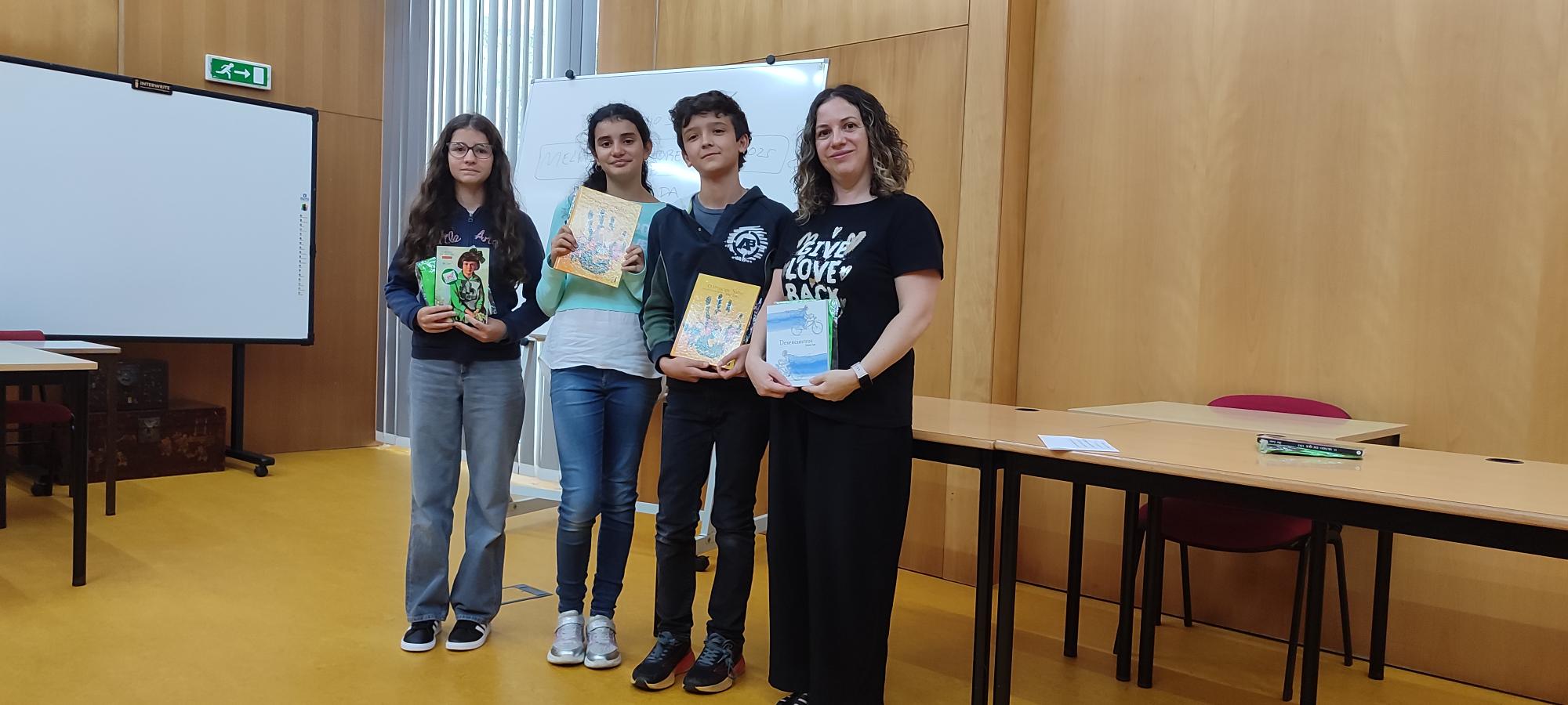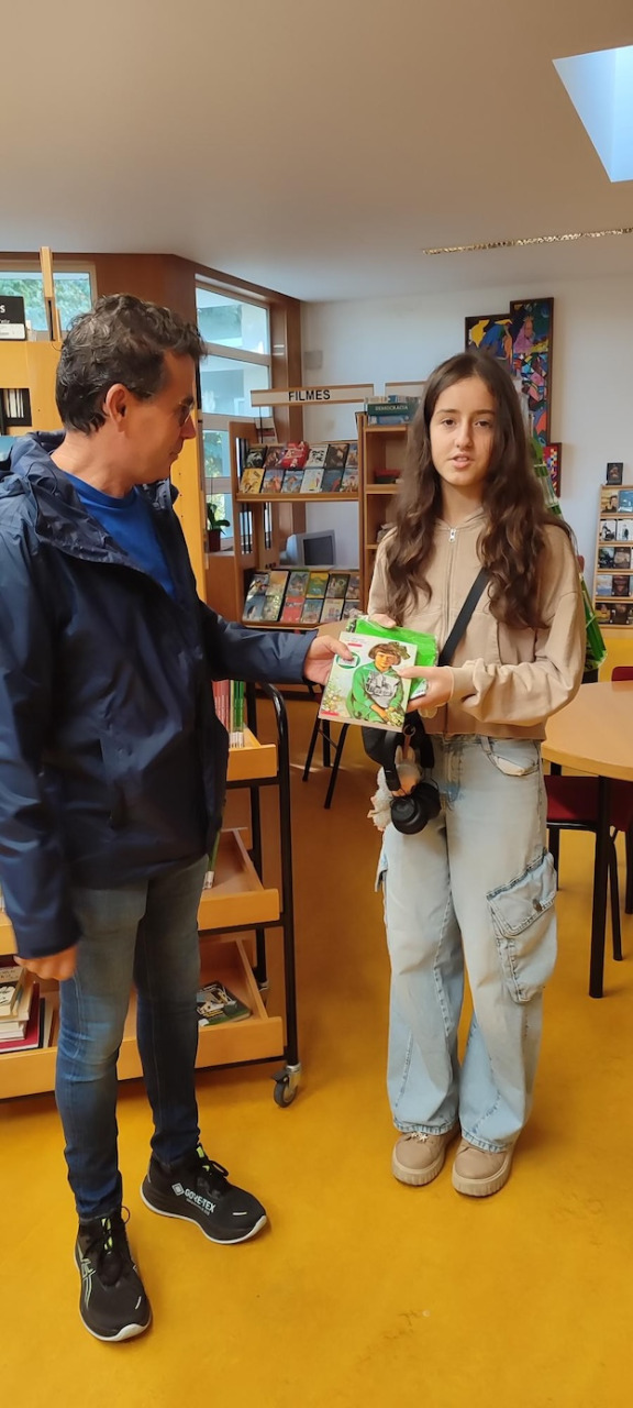 Comemora-se neste mês o Dia Nacional das Bibliotecas Escolares. Para assinalar antecipadamente a data, a Biblioteca premiou os Melhores Leitores do passado ano letivo de 2024-2025 num curto mas significativo evento realizado esta segunda-feira, no intervalo grande da manhã, no Auditório da Biblioteca. Na ocasião, receberam merecidos prémios (livros, claro) os alunos Eva da Silva Afonso (5ºB, agora no 6ºano); Lara Dias de Castro (6ºD, agora no 7º ano); Santiago Peres Passos de Araújo (5ºA, agora no 6º ano); Maria Inês Santos Silva (12ºA, agora na Universidade, em Ciências Farmacêuticas), que foi representada pela sua mãe, professora Carla Silva; Ana Maria Barbosa Lourenço (6ºE, agora no 7º ano), que receberá o seu livro noutro dia por estar ausente. Os prémios foram entregues pelos professores Pedro Câmara (da Equipa das BE), Carla Alves e Benvinda Madeira (docentes de Português) e a aluna Irina Mesquita, co-cordenadora dos Amig@s da Biblioteca e as fotografias foram tiradas pela AO da BE Helena Mendonça.